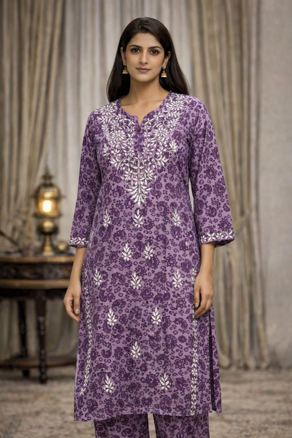 Add elegance to your everyday ethnic style with this beautiful purple printed kurta set. Featuring delicate floral patterns and detailed embroidery on the neckline, this outfit offers a perfect blend of comfort and sophistication, ideal for casual outings and small gatherings.