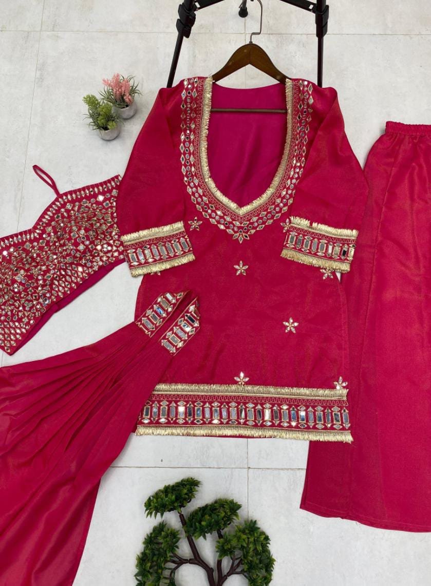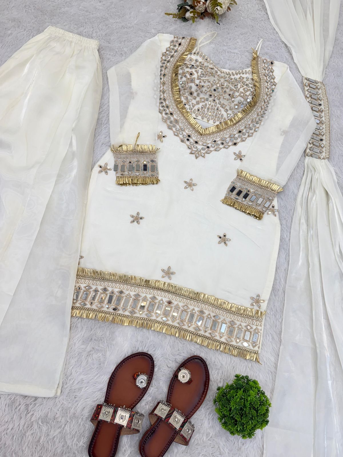 Add elegance to your festive wardrobe with this beautifully crafted kurta set featuring intricate mirror work and delicate golden detailing. Designed for a graceful look, it comes with matching pants and a lightweight dupatta, making it perfect for celebrations, parties, and traditional occasions.