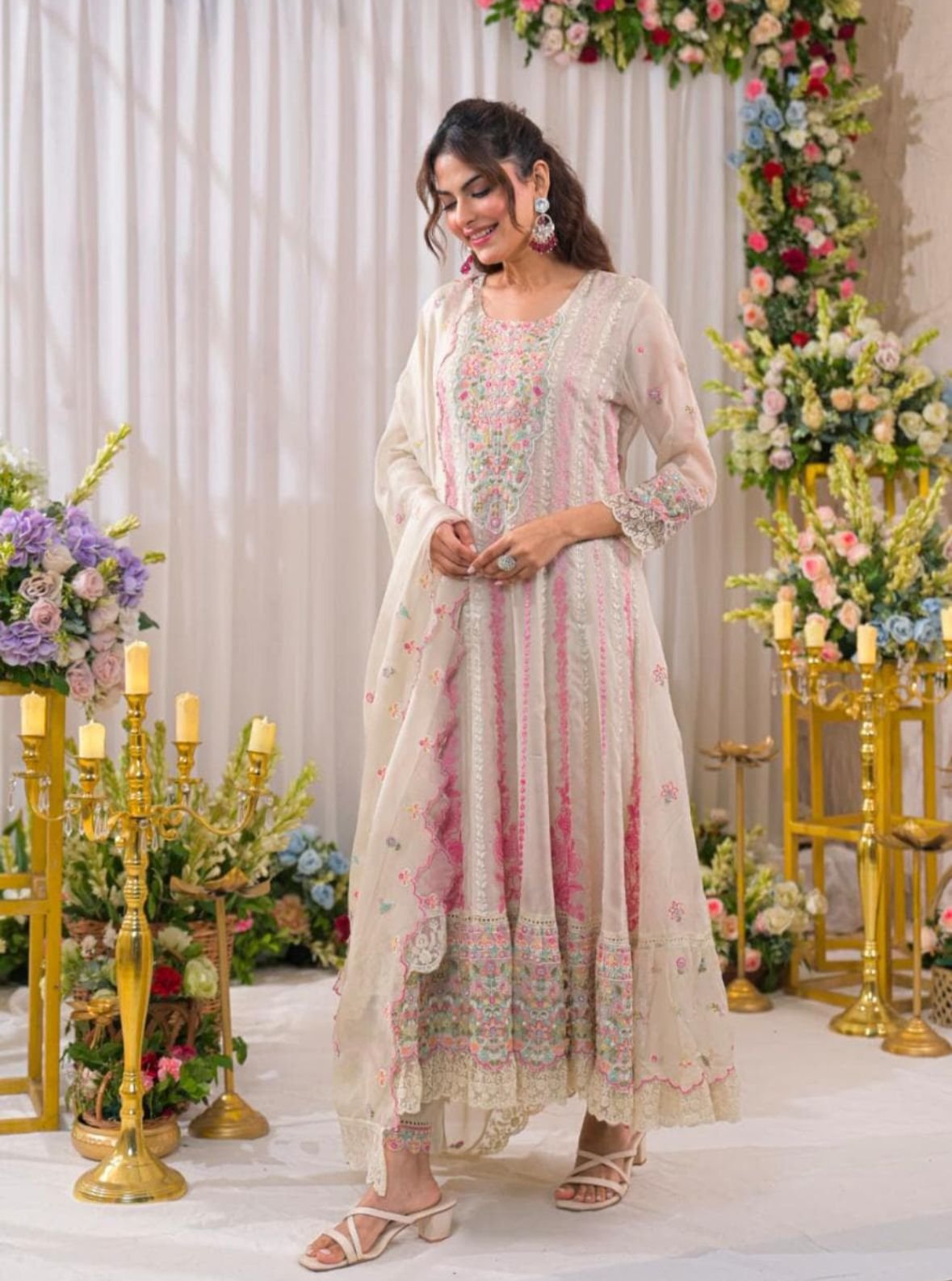 Embrace graceful elegance with this beautiful pastel Anarkali suit featuring delicate floral embroidery and soft feminine tones. Designed with a flowing silhouette and paired with a matching dupatta, this outfit is perfect for festive celebrations, parties, and special occasions.