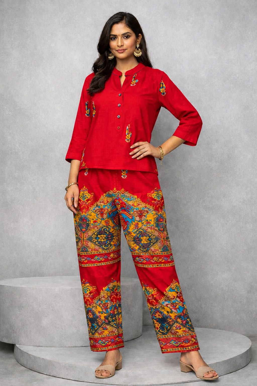 Make a bold style statement with this vibrant red co-ord set featuring a stylish top and eye-catching printed pants. Designed for comfort and modern appeal, this outfit blends traditional patterns with contemporary fashion, perfect for casual outings and everyday wear.